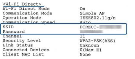 A nyomtató kinyomtatja a hálózati állapotlapot.Ezen a lapon ellenőrizheti a(z) Wi-Fi Direct (Egyszerű hozzáférési pont) SSID-azonosítóját és jelszavát.