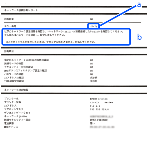 ネットワーク接続診断レポートのメッセージとエラー番号を確認して対処してください。