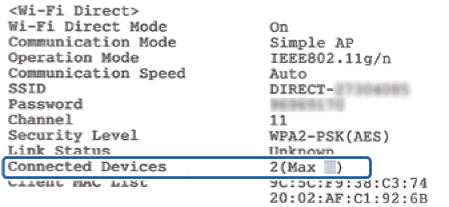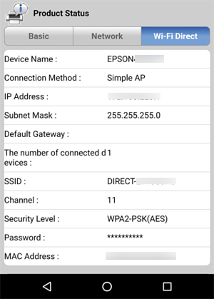 Z připojeného zařízení spusťte webový prohlížeč a poté zadejte adresu IP připojení Wi-Fi Direct (jednoduchý přístupový bod) a otevřete aplikaci Web Config. Klepněte na možnost Stav produktu > Wi-Fi Direct a zkontrolujte stav připojení Wi-Fi Direct.