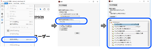 PDFマニュアルでは、探したい情報のキーワードから該当箇所を検索したり、しおりから直接ジャンプしたりすることができます。また、必要なページだけ印刷することもできます。ここでは、PDFマニュアルをコンピューターのAdobe Reader Xで開いた場合の使い方を説明します。