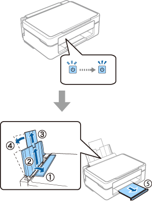 1 Make sure the power light stays on. Open the feeder guard, extend the paper support, and then tilt it backward. Pull out the out put tray.
