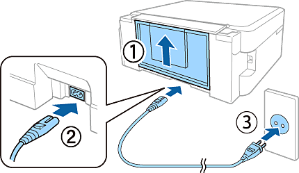 1 Zet de printer op een vlakke en stabiele ondergrond, sluit de voedingskabel aan en steek de stekker in het stopcontact.