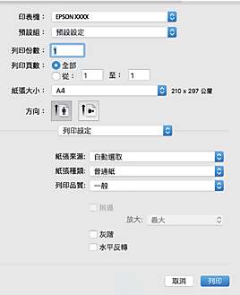 如果沒有顯示上述設定功能表,請關閉列印視窗,從[檔案]功能表選取[頁面設定],然後進行設定。