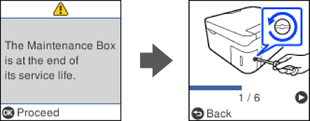 Under nogle udskrivningscyklusser kan en meget lille mængde overflødigt blæk opsamles i vedligeholdelsesboksen. For at forhindre at der spildes blæk fra vedligeholdelsesboksen, er printeren designet til at stoppe udskrivningen, når grænsen for vedligeholdelsesboksens absorberingsevne er nået. Om og hvor ofte dette vil være nødvendigt, vil variere afhængigt af antallet af sider, du udskriver, typen af materiale, der udskrives, og antallet af rengøringscyklusser, som udføres på printeren. Udskift vedligeholdelsesboksen, når du bliver bedt om det. Epson Status Monitor, LCD-skærmen eller lamperne på betjeningspanelet viser, når denne del skal udskiftes. Behovet for udskiftning af boksen betyder ikke, at printeren er holdt op med at virke, som beskrevet i specifikationerne. Epson-garantien dækker derfor ikke omkostningen for denne udskiftning. Denne del kan udskiftes af brugeren.