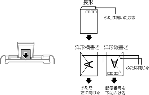 印刷する面を手前にして中央にセットし、用紙ガイドを封筒に合わせてください。