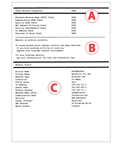 - Consultez le rapport de connexion réseau que vous avez imprimé. Vérifiez les éléments de la section A (Vérification de la connexion réseau) dont l'état est ÉCHEC.