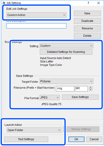 Izvršite postavke skeniranja na zaslonu Job Settings.