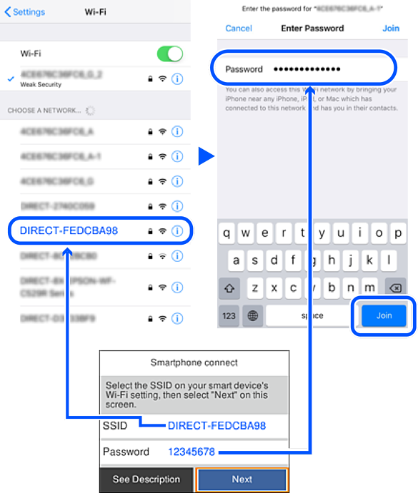 Na Wi-Fi zaslonu pametnog uređaja odaberite SSID prikazan na upravljačkoj ploči pisača i zatim unesite lozinku.