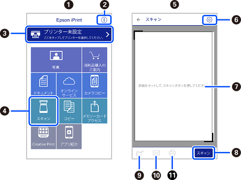 スマートデバイスでEpson iPrintを起動して、ホーム画面で使いたい項目を選択します。