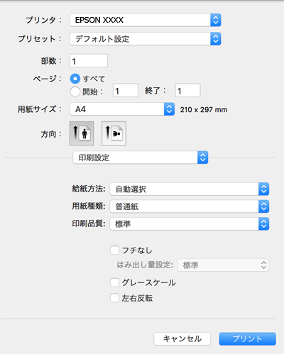 macOS Catalina (10.15)以降、macOS High Sierra (10.13)、macOS Sierra (10.12)、OS X El Capitan (10.11)、OS X Yosemite (10.10)、OS X Mavericks (10.9)、OS X Mountain Lion (10.8)で[印刷設定]メニューが表示されないときは、エプソンのプリンタードライバーが設定できていません。以下の方法で設定してください。