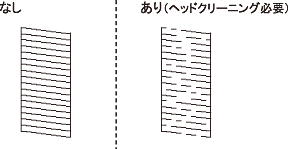 5. 印刷したパターンを見てノズルに目詰まりがあるかないかを確認します。下の「あり」の図のように、部分的に印刷されていなかったり、線が欠けたりしているときは目詰まりしています。次の手順に進んでください。「なし」の図のように全ての線が印刷されているときは目詰まりしていません。を選択してノズルチェックを終了します。