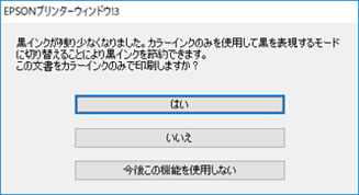 黒インクで黒を印刷します。以降、黒インクカートリッジを交換し、再び残量が少なくなるまでこの画面は表示されません。 |
