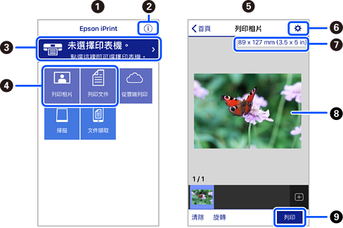 顯示可讓您選取印表機及進行印表機設定的畫面。選取印表機後,您下次就無需重新選取。 |