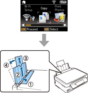 1 Make sure the home screen is displayed on the printer's screen. Open the feeder guard, extend the paper support, and then tilt it backward.