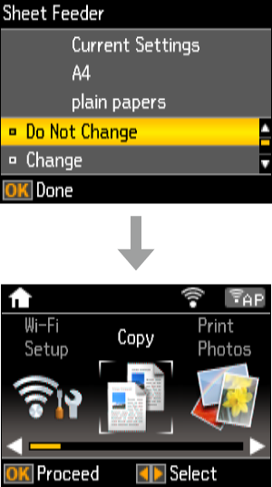 4 On the printer's screen, check that A4 is selected as a paper size and plain papers is selected as a paper type. Then press the OK button.