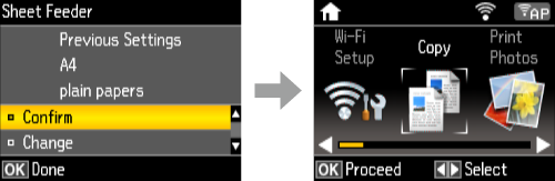 Prüfen Sie im Drucker-Display, dass A4 als Papiergröße und Normalpapier als Papiertyp eingestellt ist. Drücken Sie dann die