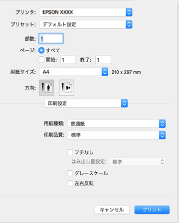 macOS Catalina (10.15)以降、macOS High Sierra (10.13)、macOS Sierra (10.12)、OS X El Capitan (10.11)、OS X Yosemite (10.10)、OS X Mavericks (10.9)、OS X Mountain Lion (10.8)で[印刷設定]メニューが表示されないときは、エプソンのプリンタードライバーが設定できていません。以下の方法で設定してください。