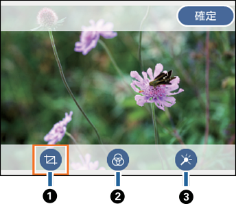 您可以裁切或旋轉相片,也可以套用色彩校正。使用 鍵在 [關閉影像校正] 與 [開啟影像校正] 之間切換。當選取 [開啟影像校正] 時,在 [編輯] 畫面上調整的色彩校正會變為在畫面上可見。當選取 [關閉影像校正] 時,色彩校正保持不可見狀態,但會對列印成品套用校正。