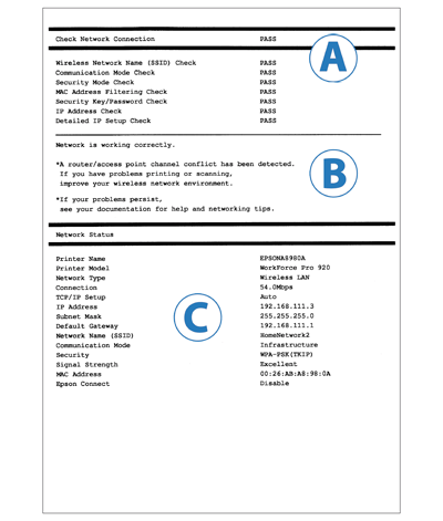 - Zapoznaj się z wydrukowanym raportem z kontroli połączenia sieciowego. Sprawdzić elementy w obszarze A (Sprawdź połączenie sieciowe), dla których stan jest określony jako BŁĄD.