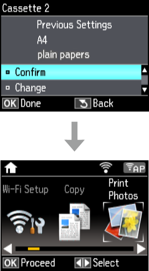 6 På skrivarens skärm, kontrollera att A4 har valts som pappersstorlek och vanligt papper har valts som en papperstyp. Tryck sedan på OK.