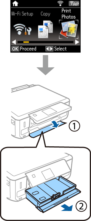 1 Se till att startskärmen visas på skrivarens skärm. Öppna den främre luckan och dra ut den nedre kassetten (papperskassett 2).