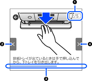 動画を構成する手順の総数と、現在表示している手順が何番目かを示します。 この画面の例では、全5手順中の2番目の手順を表示していることを示します。 |