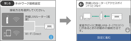 希望する接続方法のアイコンを選択して、次の画面で[設定に進む]をタップすると設定メニューが表示されます。