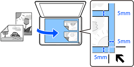 Amplasați fotografiile la 5 mm distanță de marcajul de colț al geamului scanerului. Puteți poziționa mai multe fotografii și fotografii de mărimi diferite.