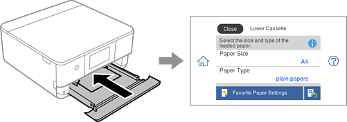 Puteți efectua setările cu ușurință înregistrând combinațiile des folosite de format și tip de hârtie ca favorite. Puteți efectua setări ale hârtiei prin simpla selectare a presetării înregistrate. Pentru a înregistra o presetare, selectați Favorite Paper Settings, selectați > pe ecranul următor, apoi specificați formatul și tipul hârtiei.