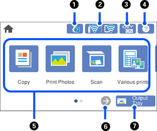 Afișează ecranul Help. Puteți vizualiza instrucțiunile de operare sau soluții la probleme. |