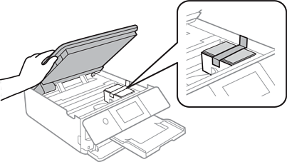 Fixați suportul cartușului de cerneală pe carcasă prin atașarea materialului de protecție furnizat în partea de sus, cu bandă.