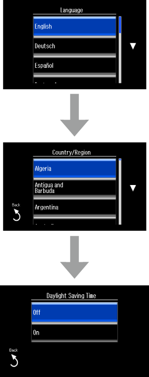 1 Select your language, country/region, and make the date and time settings. Press or swipe the screen to scroll down.