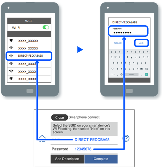 Pada layar Wi-Fi perangkat, pilih SSID yang muncul pada panel kontrol printer, lalu masukkan sandi.
