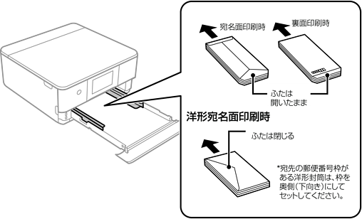 印刷する面を下にして、図の矢印の向きで用紙トレイの奥に突き当ててセットします。その後用紙ガイドを封筒の側面に合わせてください。