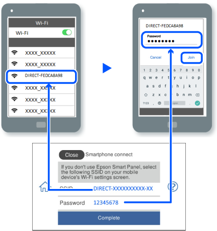5 En la pantalla de Wi-Fi del dispositivo móvil, seleccione el SSID que se muestra en el panel de control de la impresora y luego introduzca la contraseña.