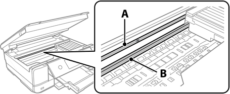 مراقب باشید که ریل (B) را لمس نکنید. در غیر این صورت، ممکن است قابلیت چاپ مختل شود. روغن روی ریل را پاک نکنید زیرا عملکرد ریل مختل میشود.
