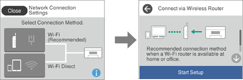 Odaberite ikonu načina povezivanja u mrežu i zatim dodirnite Start Setup na sljedećem zaslonu kako biste prikazali izbornik za postavljanje.