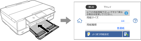 表示された用紙サイズや種類がセットした用紙と異なる場合は、項目を選択して変更してください。このままでいい場合は画面を閉じてください。