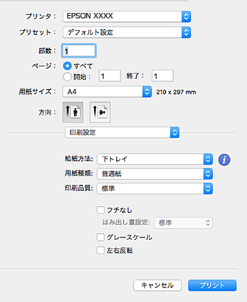macOS High Sierra、macOS Sierra、OS X El Capitan、OS X Yosemite、OS X Mavericks、OS X Mountain Lionで[印刷設定]メニューが表示されないときは、エプソンのプリンタードライバーが設定できていません。以下の方法で設定してください。macOS Mojaveはテキストエディットなどアップル社製アプリケーションソフトで[印刷設定]ができません。
