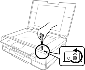 Izskrūvējiet skrūvi ar plakano skrūvgriezi, līdz apkopes nodalījuma pārsegu var noņemt no printera.