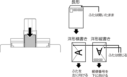 印刷する面を手前にして中央にセットし、用紙ガイドを封筒の側面に合わせてください。