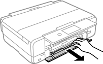 Ak používate papier formátu Legal, vyberte zásuvku CD/DVD z priestoru pod zásobník papiera 2. Potom stlačte tlačidlo na kazete a vysúvajte ju podľa obrázka.