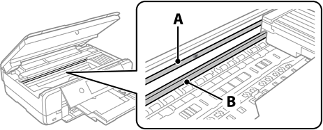 請小心不要觸碰到軌道 (B)。否則,您可能會無法列印。請勿清除軌道上的油脂,因為這是印表機運作時必要的物質。